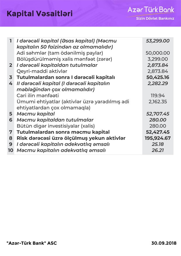 30 Sentyabr 2018-ci il tarixində “Azər -Türk Bank” 52 milyon 427 min manat məcmu kapitala malik olub.