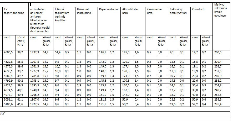2018-ci ilin 10 ayı ərzində cəmi kredit qoyuluşlarının 524 milyon manat artmasına ən böyük töhfəni istehlak kreditləri verib. Yanvar-Oktyabr dövründə ev təsərrüfatlarına verilmiş kreditlər 500 milyon manat artaraq ötən ilin sonundakı 4 milyard 606 milyon manatdan 5 milyard 106 milyon manata qalxıb.