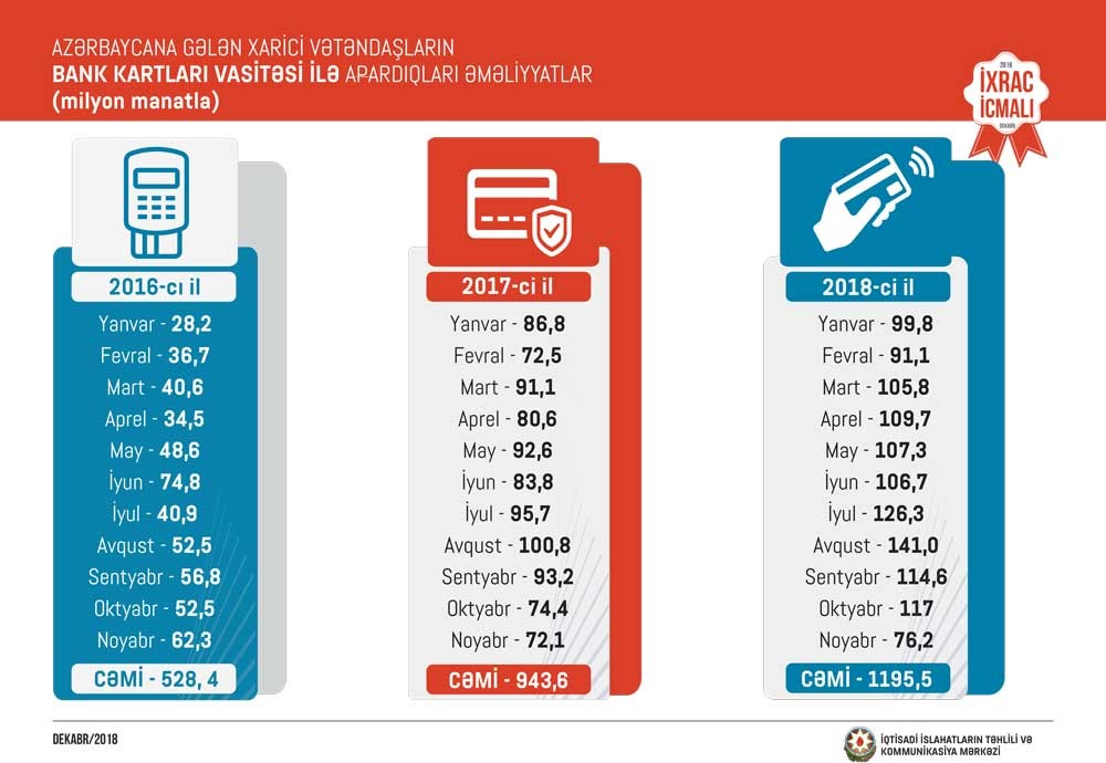 2018-ci ildə ölkəmizə gələn xarici vətəndaşların bank kartları vasitəsi ilə xərcləmələrində dinamik artım müşahidə edilib. Belə ki, 2018-ci ilin yanvar-noyabr ayları ərzində Azərbaycana gələn xarici vətəndaşların bank kartları vasitəsi ilə apardıqları əməliyyatların dəyəri 1 milyard 195,5 milyon manat təşkil edib. 2017-ci ilin müvafiq dövrü ilə müqayisədə 2018-ci ilin yanvar-noyabr ayları ərzində Azərbaycana gələn xarici vətəndaşların bank kartları vasitəsi ilə apardıqları əməliyyatların dəyəri 252 milyon manat və ya 27 faiz artıb.