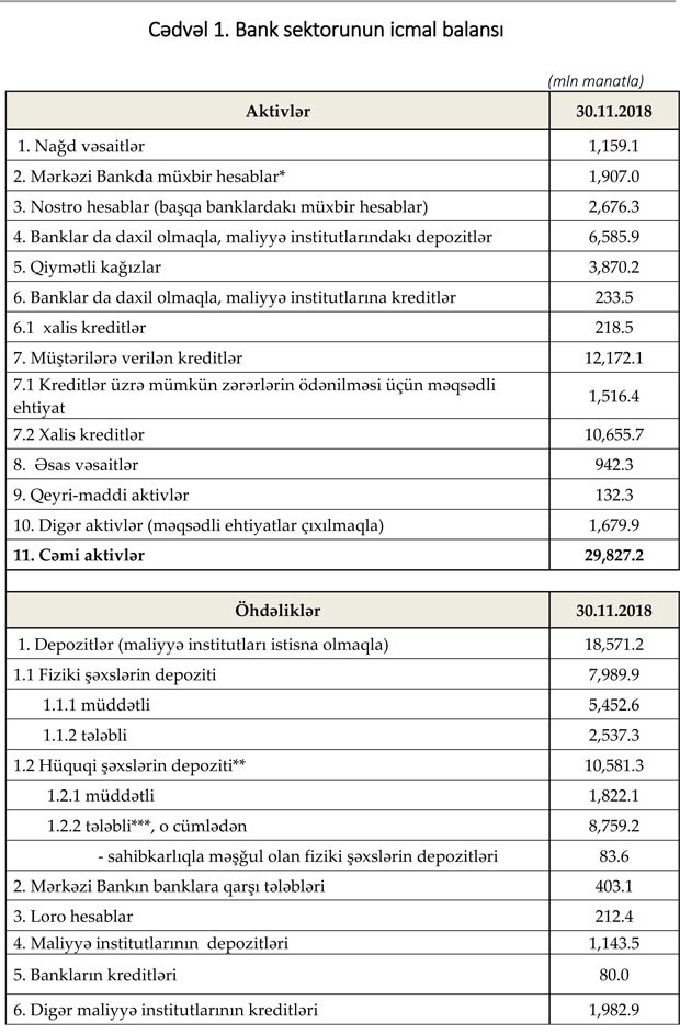 30 noyabr 2018-ci il tarixinə Azərbaycanda fəaliyyət göstərən bankların cəmi aktivləri 29 milyard 827.2 milyon manat, cəmi öhdəlikləri isə 25 milyard 579.7 milyon manat təşkil edib.Sektorun balans kapitalı isə 4 milyard 247.5 milyon manat olub.