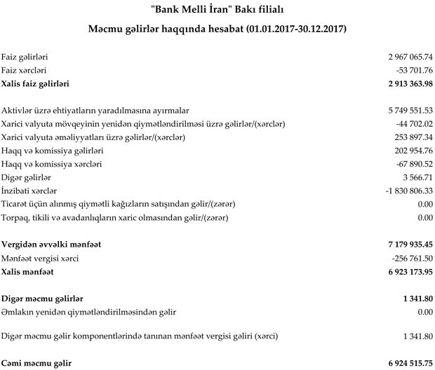 2017-ci ildə "Bank Melli İran" Bakı filialının xalis mənfəətinin yüksək olması kredit və depozit itkiləri üzrə yaradılmış ehtiyatın 5 milyon 750 min manatının azad olması idi. Ötən il yaradılmış ehtiyatın cəmi 521 min manatı azad olub. Qeyd edək ki, kredit riskləri azalan və ya gecikmədə olan kredilər geri qaytarılan zaman ehtiyatlar azad olur və gəlirə əlavə edilir.