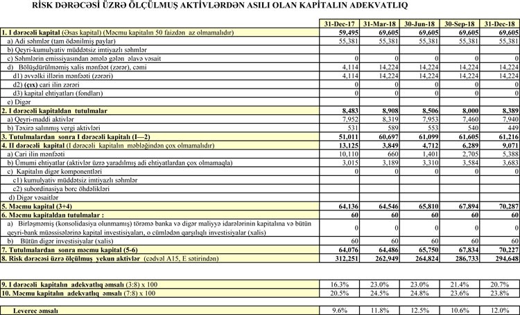 İllik müqayisədə Bankın məcmu kapitalı 64 milyon 76 min manatdan 70 milyon 227 min manata qalxıb.