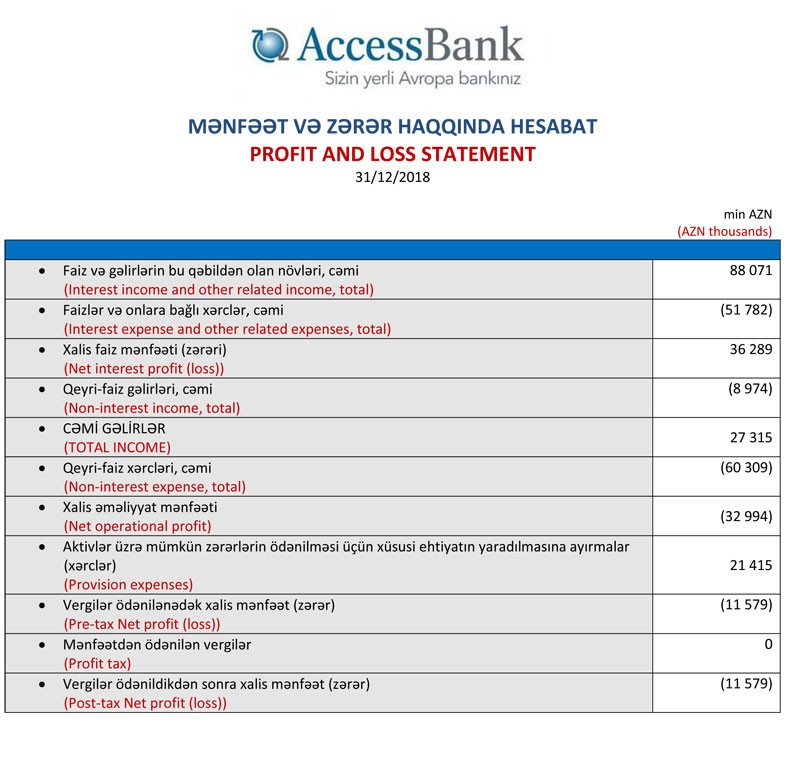 Cəmi gəlirlərdən faiz və qeyri-faiz xərcləri çıxıldıqdan sonra ötən il “AccessBank”ın 32 milyon 994 min manat xalis əməliyyat zərəri yaranıb. Bu zərər 2017-ci illə müqayisədə 22,7% azdır. 2017-ci ildə “AccessBank”ın xalis əməliyyat zərəri 42 milyon 692 min manat təşkil etmişdi.