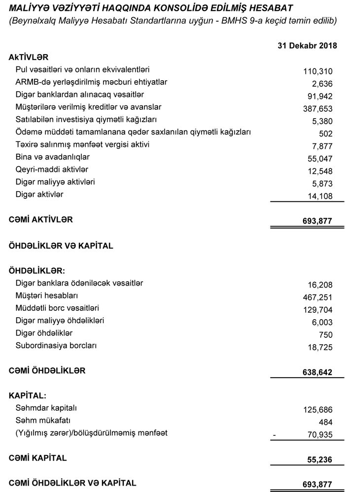 30 Dekabr 2018-ci il tarixində “Unibank” 693 milyon 877 min manat cəmi aktivlərə, 638 milyon 642 min manat cəmi öhdəliklərə və 55 milyon 236 min manat cəmi balans kapitalına malik olub.