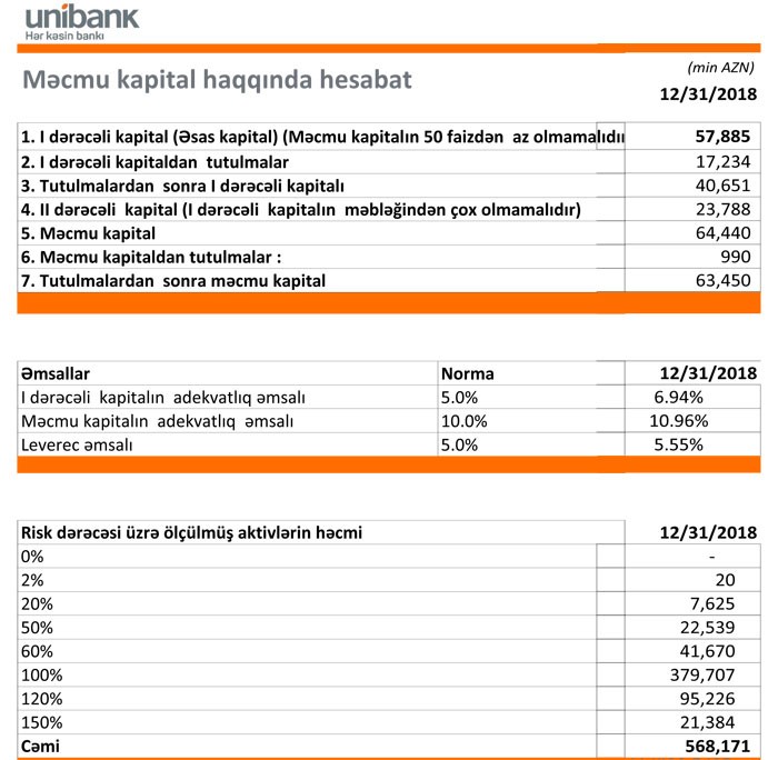 2018-ci ilin sonunda “Unibank” 63 milyon 450 min manat məcmu kapitala malik olub. 2017-ci ilin sonunda bu məbləğ 67 milyon 488 min manat idi.