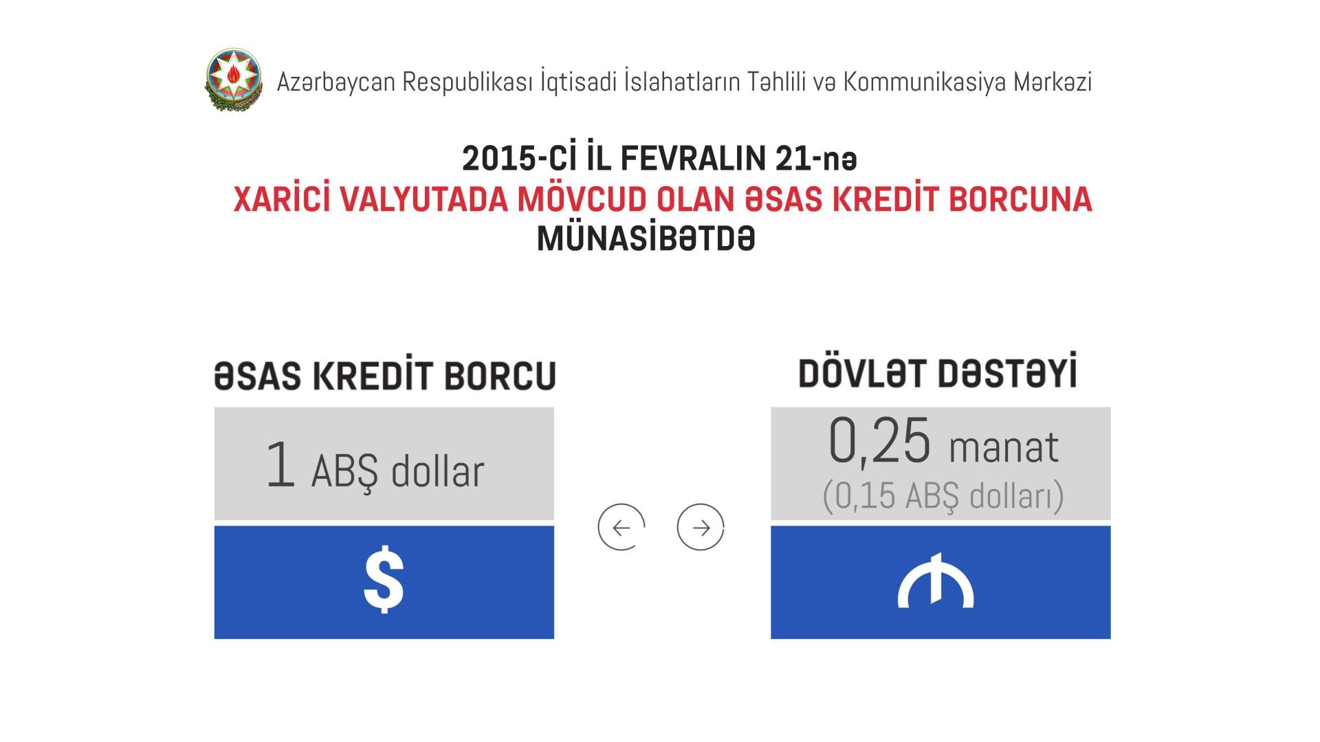 Prezident İlham Əliyevin Fərmanını şərh edən İqtisadi İslahatların Təhlili və Kommunikasiya Mərkəzinin icraçı direktoru Vüsal Qasımlı bildirib ki, dövlət dəstəyini müəyyən etmək üçün 2015-ci il fevralın 21-i və dekabrın 21-i tarixləri, başqa sözlə, məzənnə dəyişdiyi tarixlər əsas götürülüb: “2015-ci il fevralın 21-nə xarici valyutada mövcud olan əsas kredit borcuna münasibətdə – 1 ABŞ dollarına 0,25 manat (0,15 ABŞ dolları) və 2015-ci il fevralın 22-dən həmin ilin dekabrın 21-dək bağlanmış kredit müqavilələri üzrə xarici valyutada əsas kredit borcuna münasibətdə – 1 ABŞ dollarına 0,6 manat (0,35 ABŞ dolları) kimi qiymətləndirmə olacaq. 2015-ci il fevralın 21-nə və dekabrın 21-nə mövcud olmuş xarici valyutada əsas kredit borclarına hər iki qayda tətbiq olunur.”