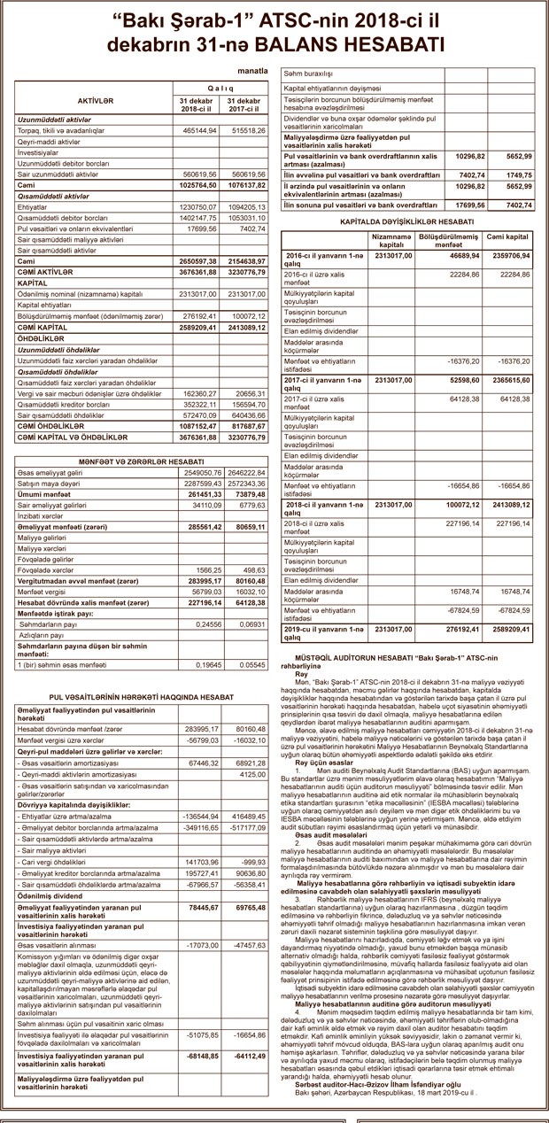 “Bakı Şərab-1” ATSC 2018-ci ili 227 min manat xalis mənfəət ilə başa vurub. Bu, 2017-ci illə müqayisədə 3,5 dəfə döxdur. “Bakı Şərab-1” 2017-ci ili 64 min manat xalis mənfəətlə bağlamışdı.