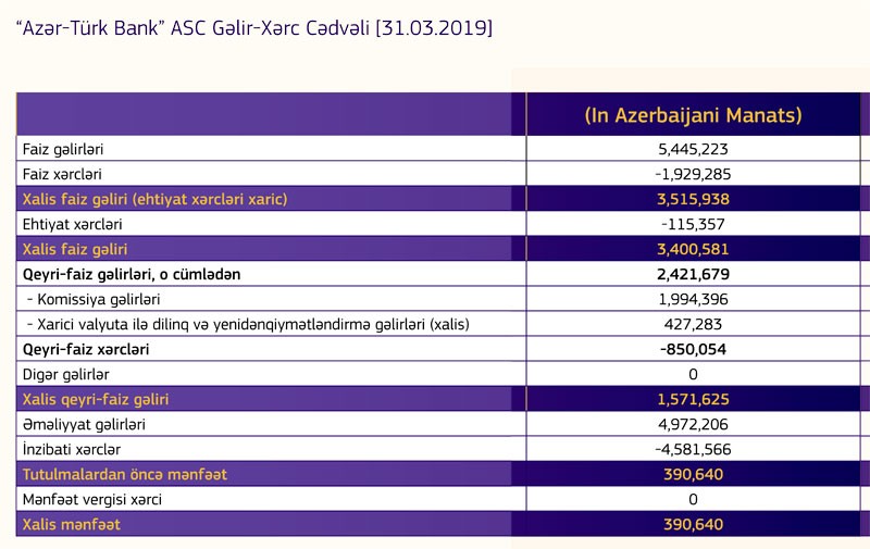 Müqayisə üçün qeyd edək ki, 2018-ci ilin yanvar-mart dövründə “Azər -Türk Bank”ın cəmi gəlirləri 15 milyon 741 min manat, cəmi xərcləri isə 15 milyon 548 min manat, xalis mənfəəti 192 min manat təşkil etmişdi.