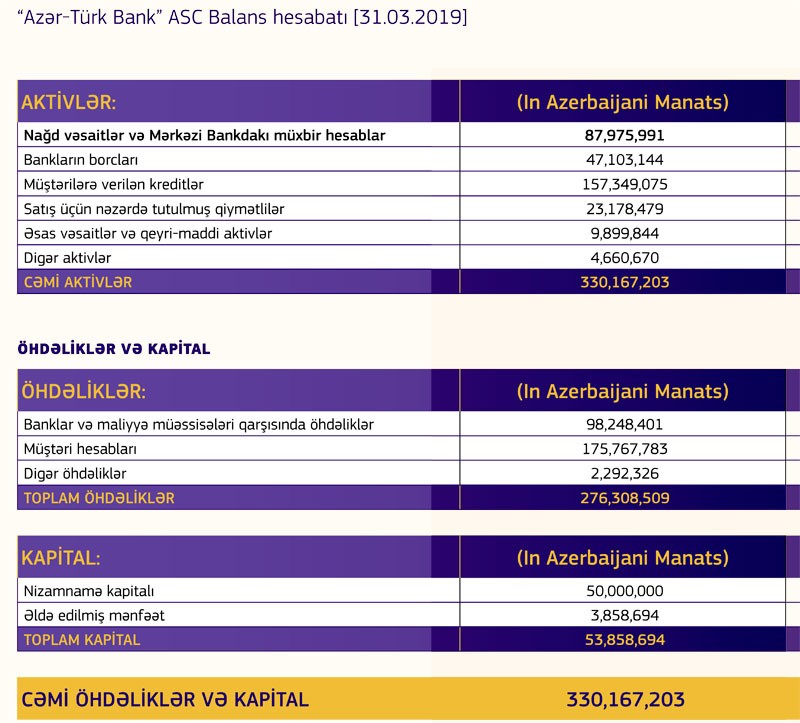 31 Mart 2019-cu il tarixində “Azər - Türk Bank” 330 milyon 167 min manat cəmi aktivlərə, 276 milyon 308 min manat cəmi öhdəliklərə və 53 milyon 859 min manat cəmi balans kapitalına milik olub. Aktivlərin 157 milyon 349 min manatını müştərilərə verilən kreditlər təşkil edib.