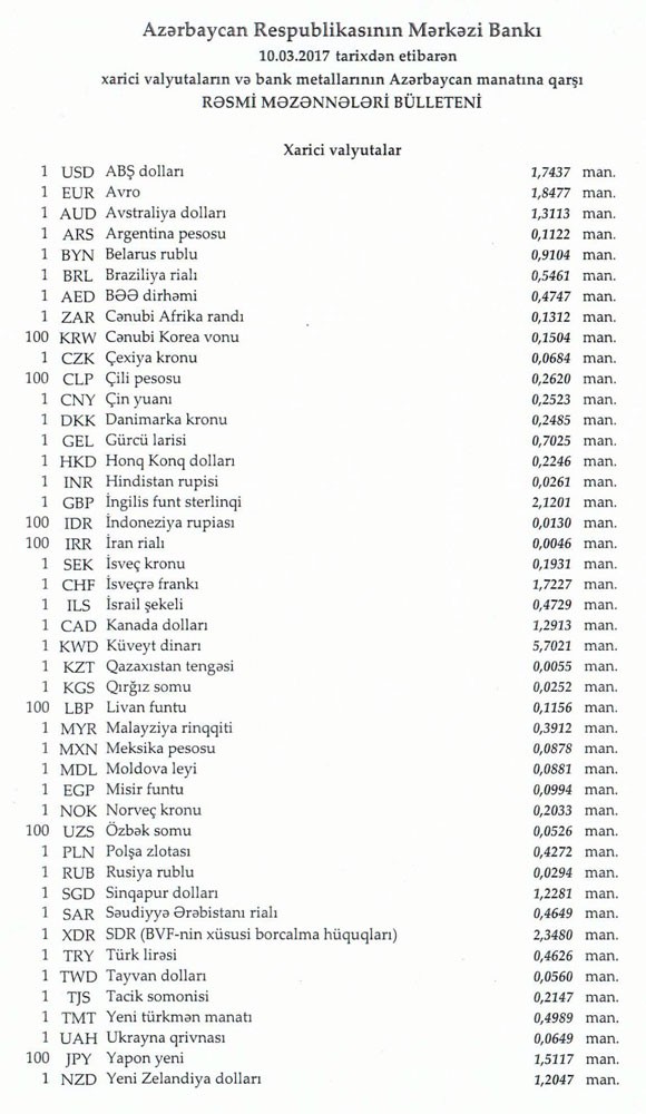 Martın 10-na Mərkəzi Bankın açıqladığı rəsmi Dollar/manat məzənnəsi Martın 9-u ilə müqayisədə düşərək 1,7437 manat olub, Avro/manat məzənnəsi isə 1.8477 manata geriləyib.