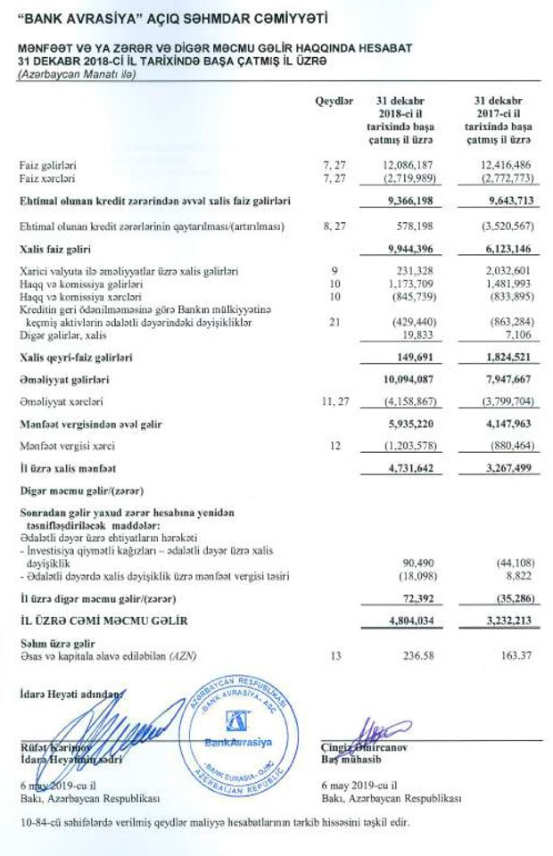 Auditorun hesabatına görə, “Bank Avrasiya” 2018-ci ili 4 milyon 732 min manat xalis mənfəətlə başa vurub. Bank 2017-ci ili 3 milyon 267 min manat xalis mənfəətlə bağlamışdı. Mənfəətin artması ehtimal olunan kredit zərərlərinin qaytarılması üçün yaradılan ehtiyata ayırmanın azalması ilə bağlıdır. 2017-ci ildə faiz gəlirlərinin 3 milyon 521 min manatı ehtiyata ayrılmışdı. Ötən isə ehtiyatın 578 min manatı azad olaraq gəlirə əlavə edilib.