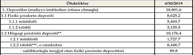 Belə ki, depozitlər müddətli və tələbli depozitlərdən ibarətdir. Apreldə müddətli depozitlər cəmi 4 milyon manat, tələbli depozitlər isə 367 milyon manat artıb. 30 Aprel 2019-cu il tarixində müddətli depozitlər 5 milyard 470 milyon manat, tələbli depozitlər isə 3 milyard 156 milyon manat təşkil edib.