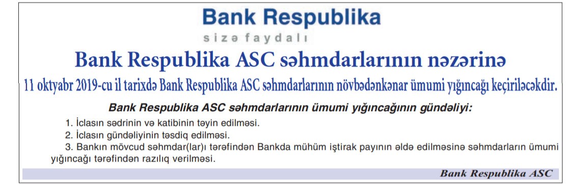 11 Oktyabr 2019-cu il tarixində "Bank Respublika" ASC səhmdarlarının növbədənkənar ümumi yığıncağı keçiriləcək.