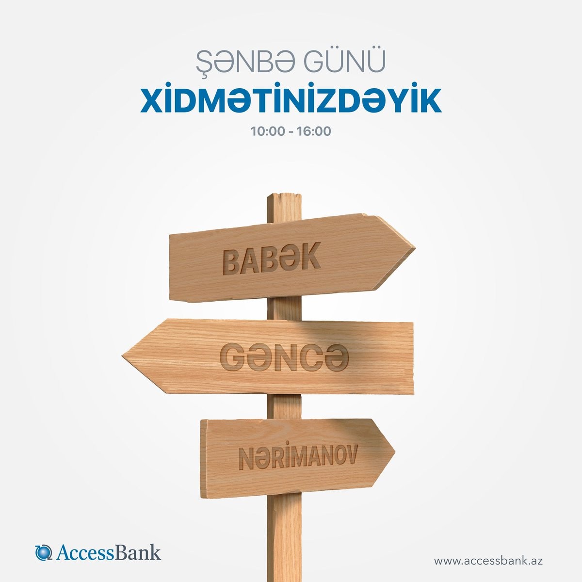 “Marja” xəbər verir ki, “AccessBank”, 21 sentyabrdan etibarən “Babək”, “Nərimanov” və “Gəncə” filiallarının "sizin rahatlığınız üçün" şənbə günləri də fəaliyyət göstərəcəyini açıqlayıb.