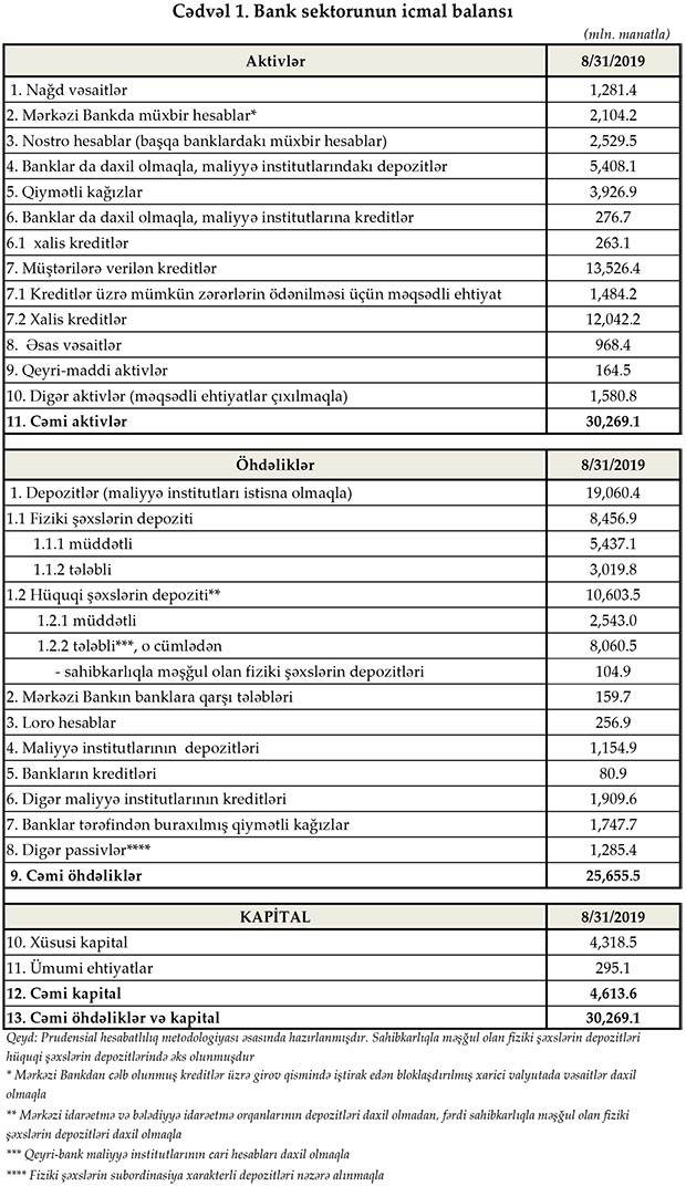 Maliyyə Bazarlarına Nəzarət Palatasının yaydığı press-relizdə bildirilir ki, 31 avqust 2019-cu il tarixinə Azərbaycanda fəaliyyət göstərən bankların cəmi aktivləri 30 milyard 269 milyon 1 min manat, cəmi öhdəlikləri isə 25 milyard 655 milyon 5 min manat təşkil edib. Sektorun balans kapitalı 4 milyard 613 milyon 6 min manat olub.