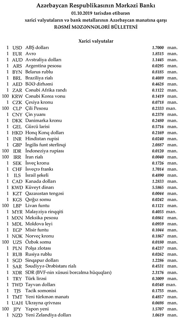 2019-cu ilin Oktyabr ayının 01-nə Mərkəzi Bankın açıqladığı rəsmi Dollar/Manat məzənnəsi Sentyabrın 30-u ilə müqayisədə dəyişməyərək 1,7000 manat olub, Avro/manat məzənnəsi 1.8515 manata, Rubl/manat məzənnəsi isə 0,0262 manata düşüb.