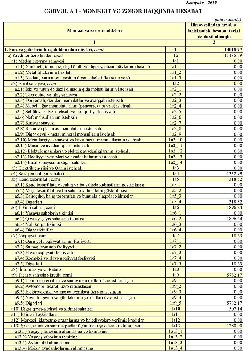Müqayisə üçün qeyd edək ki, 2018-ci ilin yanvar-sentyabr dövründə “Ziraat Bank Azərbaycan” ASC-nin cəmi gəlirləri 13 milyon 63 min manat, cəmi xərcləri 8 milyon 705 min manat, əməliyyat mənfəəti 4 milyon 358 min manat təşkil etmişdi. Bank əməliyyat mənfəətinin 2 milyon 516 min manatını ehtiyatın yaradılmasına ayırdığından və 237 min manat mənfəət vergisi ödədiyindən mənfəəti 1 milyon 604 min manata düşmüşdü.