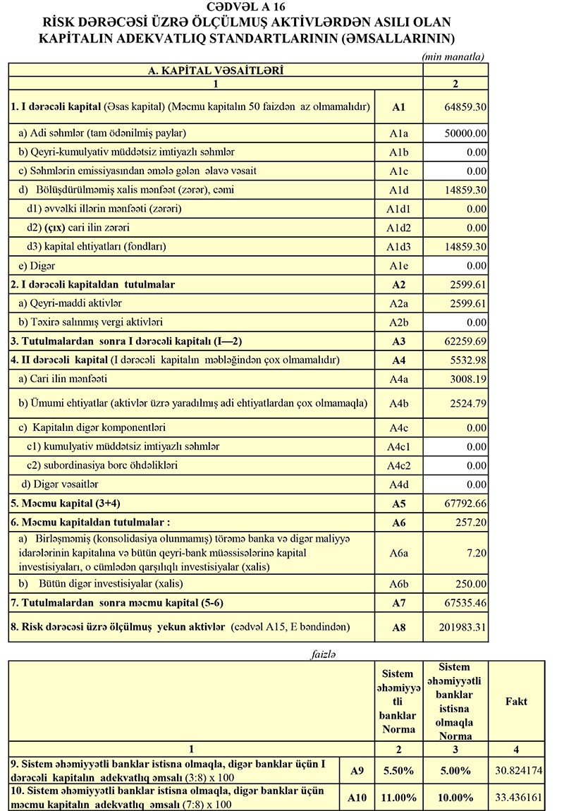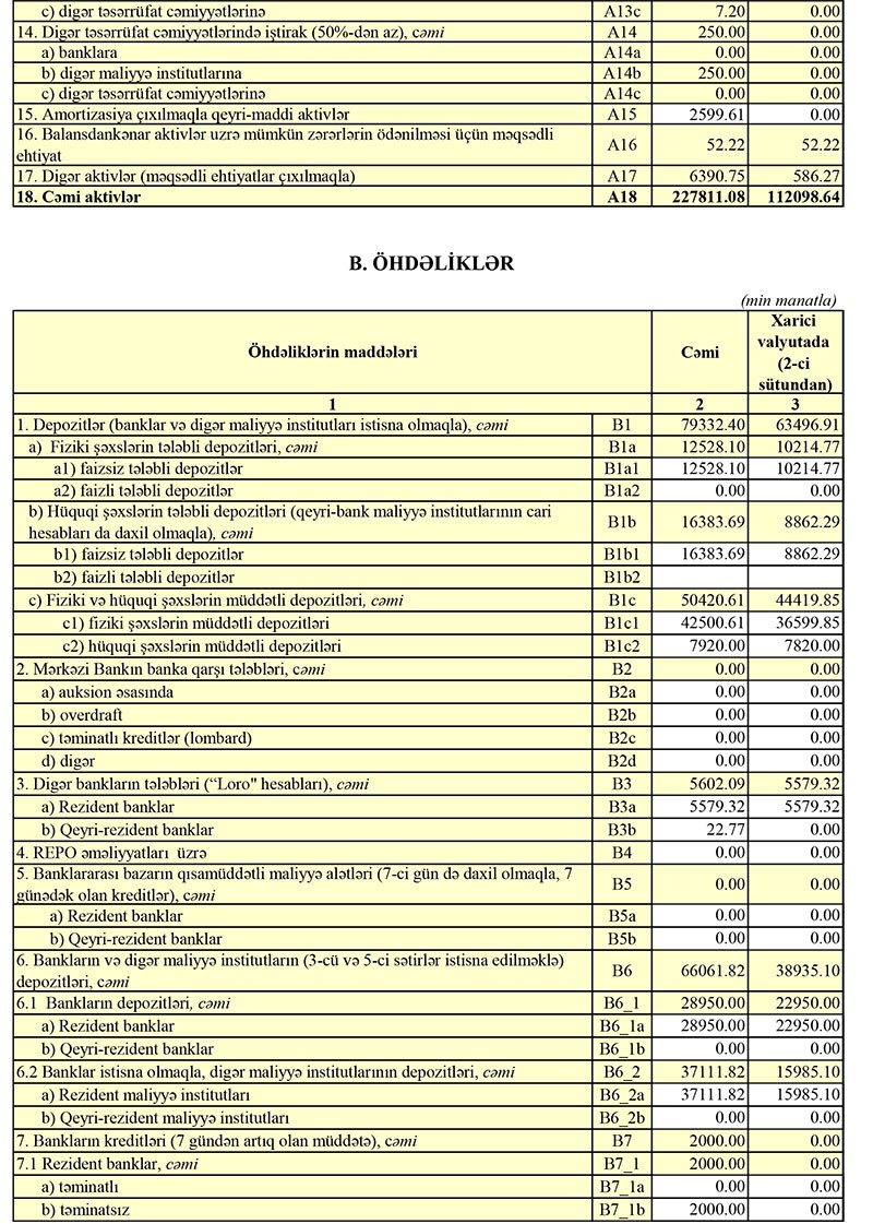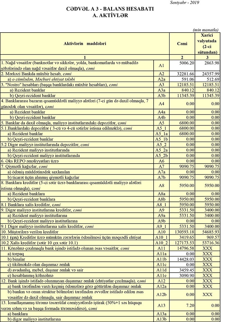 9 ay ərzində Bankın cəmi aktivləri isə cüzi azalaraq 227 milyon 918 min manatdan 227 milyon 811 min manata geriləyib. Azalma Mərkəzi Bankda müxbir hesabın və "Nostro" hesabların (başqa banklardakı müxbir hesabları) düşməsilə əlaqədardır.