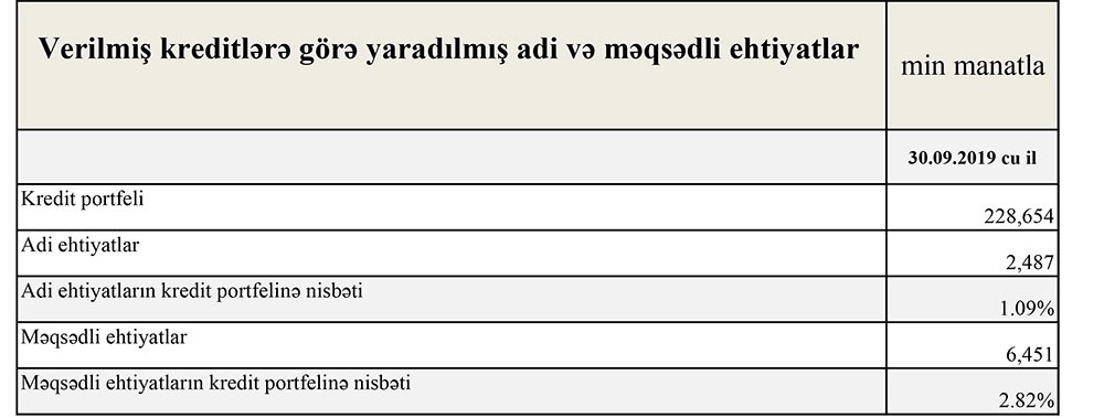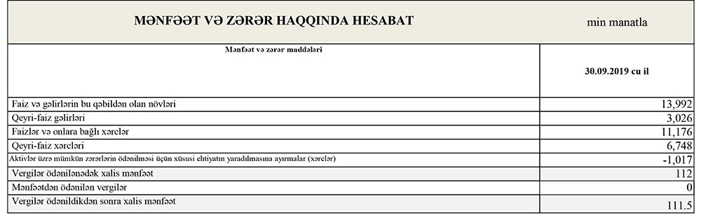 Qısası, 2019-cu ilin 9 ayında “NBC Bank”ın 17 milyon 18 min manat cəmi gəlirlərinə qarşılıq cəmi xərcləri 17 milyon 924 min manat təşkil edib. Xərclər gəlirləri üstələdiyindən 906 min manat əməliyyat zərəri yaranıb. Lakin əvvəlki dövrlərdə ehtimal olunan kredit və depozit itkiləri üçün yaradılmış ehtiyatdan 1 milyon 17 min manatın azad olması həm əməliyyat zərərini bağlayıb, həm də 111 min manat xalis mənfəətin yaranmasını təmin edib.