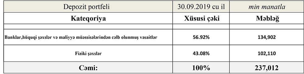 “NBC Bank”ın depozit portfeli də artıb. Ötən ilin sonunda 106 milyon 426 min manat təşkil etmiş depozitlər 30 Sentyabr 2019-cu il tarixində 123 milyon 264 min manata çatıb (16 milyon 838 min manat artım).