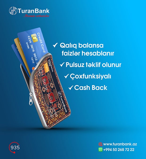 Çoxlarının pul qabında bir ədəd məvacib, bir ədəd əmanət bir ədəd isə qeyri nağd alış-veriş üçün nəzərdə tutulan plastik kart tapmaq olar. Halbuki, TuranBank müştərilərinin rahatlığını nəzərə alaraq bütün bu mövcud ehtiyacları bir kartda birləşdirdi. “Universal” kart sadəcə pul qabı deyil, həm də sizə pul qazandırır. Belə ki, kartın qalıq balansına illik 6%-dək gəlir və tərəfdaş mağaza və əyləncə mərkəzləri şəbəkəsində 18%-dək Cash Back hesablanır. Kart 3 valyutada pulsuz təqdim olunur. Qeyd edək ki, bankın ATM və Pos-terminallarından bu kartdan nağdlaşdırma üzrə komissiya 0% təşkil edir.