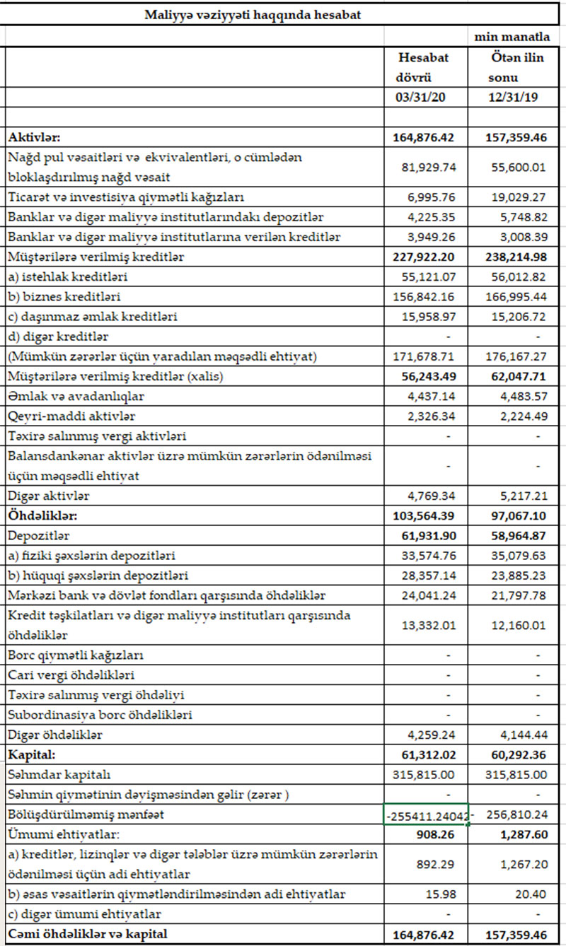 31 Mart 2020-ci il tarixində Bank 255 milyon 411 min manat yığılmış zərərə malik olub.