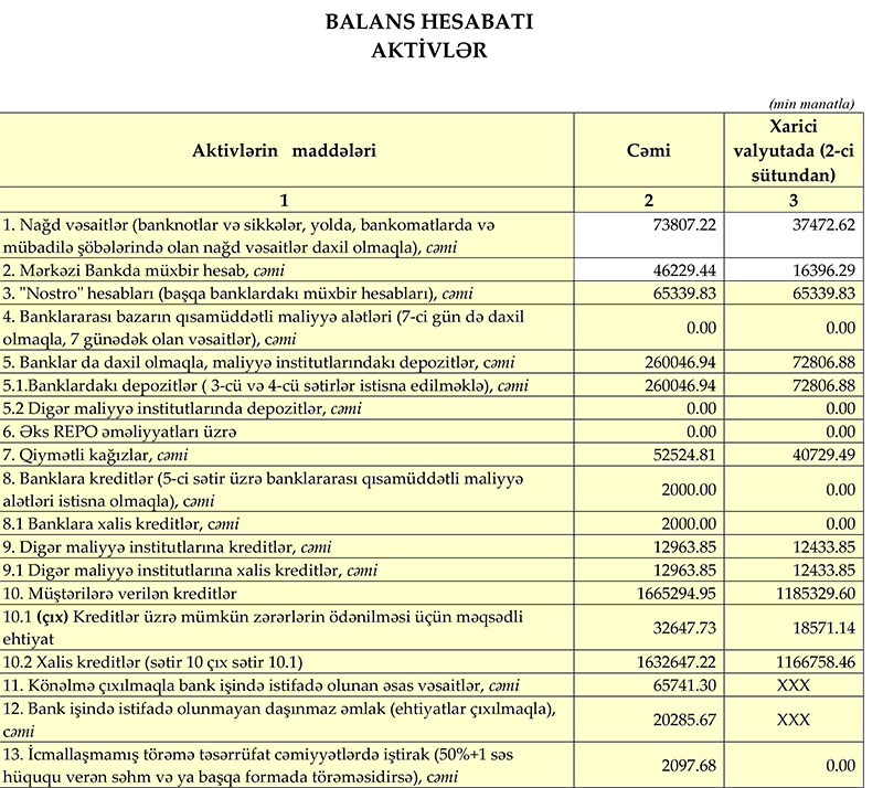 Qeyd olunan tarixə Bankın müştərilərə verdiyi kreditlərinin həcmi isə 14,18% və ya 206,85 milyon manat artaraq 1 milyard 665 milyon manata çatır. Bankın depozit portfelinin həcmi 2020-ci ilin I rübünün sonuna 7,59% və ya 109,37 milyon manat artaraq 1,55 milyard manat təşkil etmişdir.
