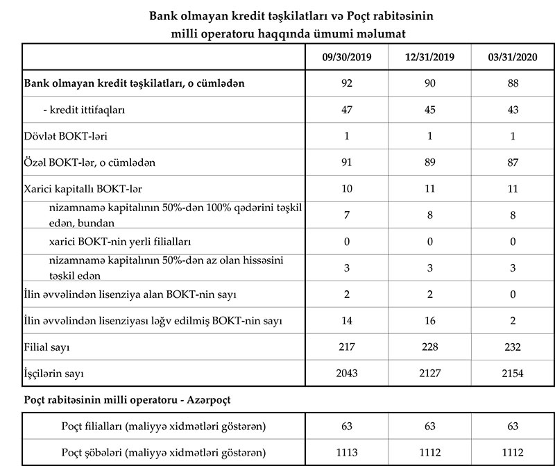 Bu il aprelin 1-nə BOKT-ların aktivləri 349,4 milyon manat olub ki, bunun da 246,2 milyon manatı müştərilərə verilmiş xalis kreditlərdir. Martın sonuna BOKT-lar 208,4 milyon manat öhdəliklərə, 141 milyon manat balans kapitalına malik olub.
