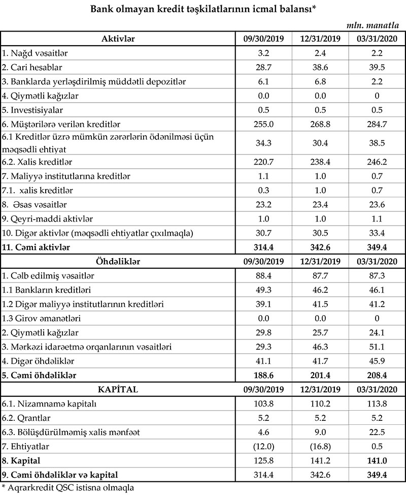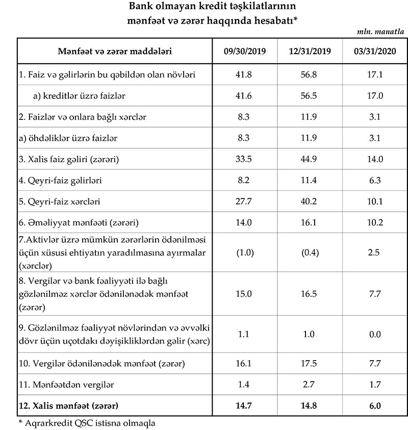 Azərbaycandakı bank olmayan kredit təşkilatları (BOKT) bu ilin I rübünü 6 milyon manat xalis mənfəətlə başa vurub.