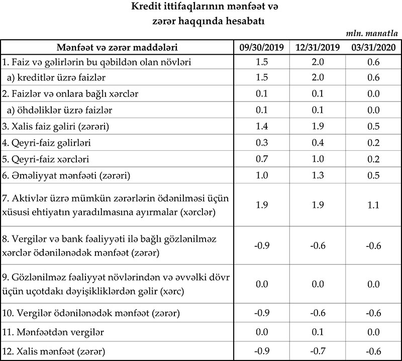 Məlumata görə, rüb ərzində BOKT-ların əməliyyat gəlirləri 23,4 milyon manat, əməliyyat xərcləri 13,2 milyon manat, xüsusi ehtiyatlara ayırmalar üzrə qənaəti 2,5 milyon manat, mənfəət vergisi ödəmələri isə 1,7 milyon manat təşkil edib.