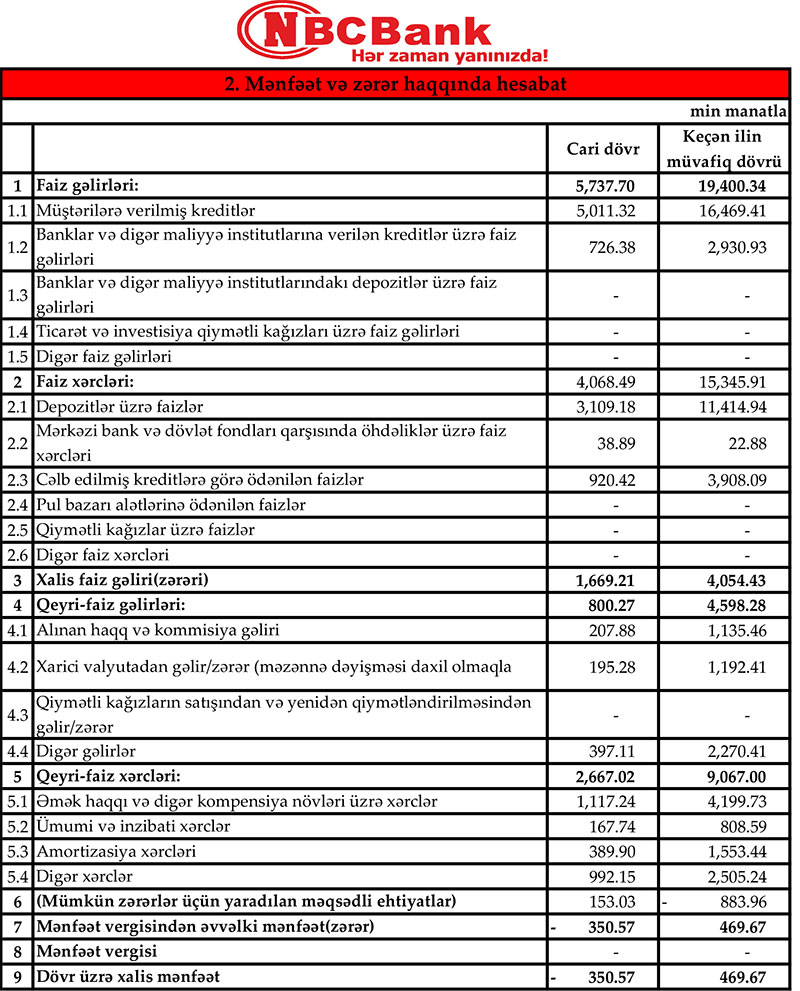 Marja Banka istinadən xəbər verir ki, 2020-ci ilin yanvar – mart dövründə NBC Bank-ın cəmi əməliyyat gəlirləri 6 milyon 538 min manat, cəmi əməliyyat xərcləri 6 milyon 735 min manat təşkil edib. Xərclər gəlirləri üstələdiyindən Bankın 197 min manat əməliyyat zərəri yaranıb. Bank mümkün zərərlər üçün yaradılan məqsədli ehtiyatlara 153 min manat da ayrıma nəzərdə tutduğundan ilk rübü 350 min manat zərər ilə başa vurub.