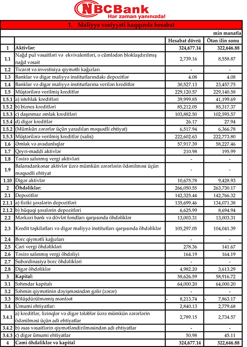 Müştəriləri verilmiş kreditlər isə 229 milyon 120 min manat olmaqla, cəmi depozitlər isə 142 milyon 325 min manat olmaqla təxminən dəyişməz qalıb.