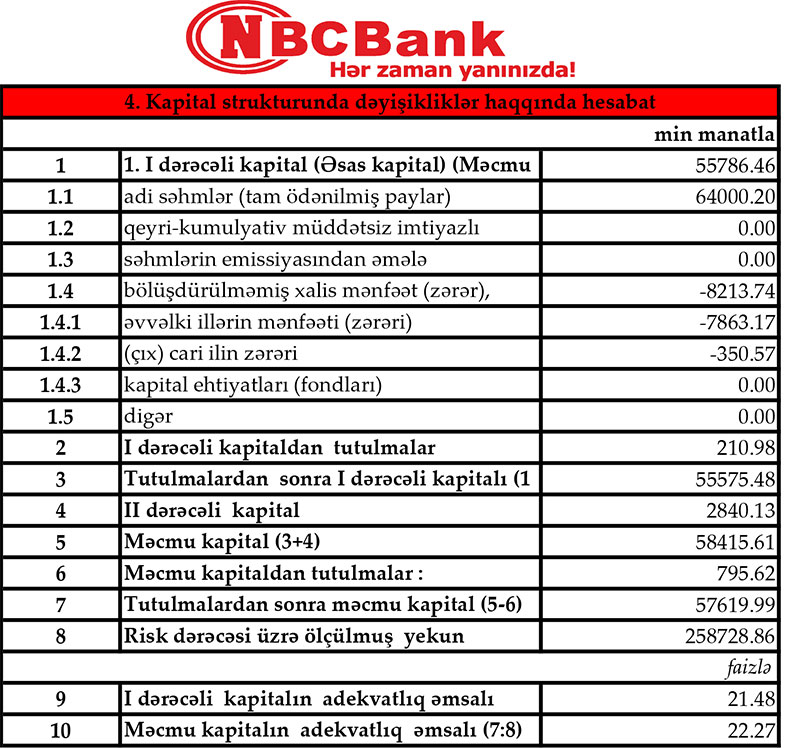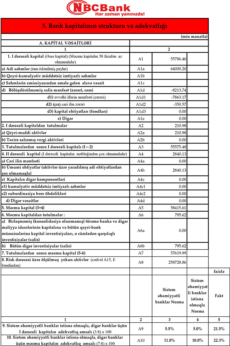 NBC Bankda I dərəcəli kapitalın adekvatlıq əmsalı və məcmu kapitalın adekvatlıq əmsalı normalardan yüksəkdir. 31 Mart 2020-ci il tarixində Bankda I dərəcəli kapitalın adekvatlıq əmsalı 21.5% (norma 5%), məcmu kapitalın adekvatlıq əmsalı 22.3% (norma 10%). NBC Bank tələblərə cavab verdiyindən bu banka da inzibatçının təyin olunması müştəriləri təəcübləndirib.
