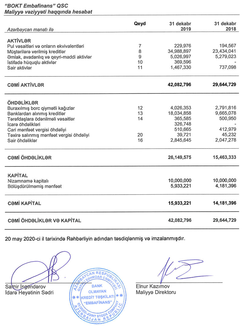 31 Dekabr 2019-cu il tarixində “Embafinans” 15 milyon 933 min manat cəmi kapitala malik olub.