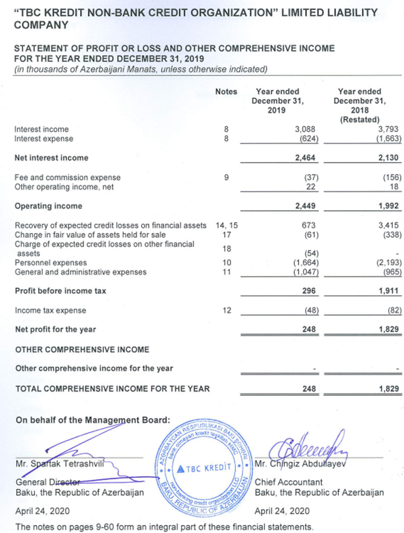 “TBC Kredit” Bank olmayan kredit təşkilatı 2019-cu ili 248 min manat xalis mənfəət ilə başa vurub. 2018-ci illə müqayisədə ötən il təşkilatın xalis mənfəəti 7,4 dəfə azalıb. Belə ki, “TBC Kredit” 2018-ci ili 1 milyon 829 min manat xalis mənfəət ilə bağlamışdı.