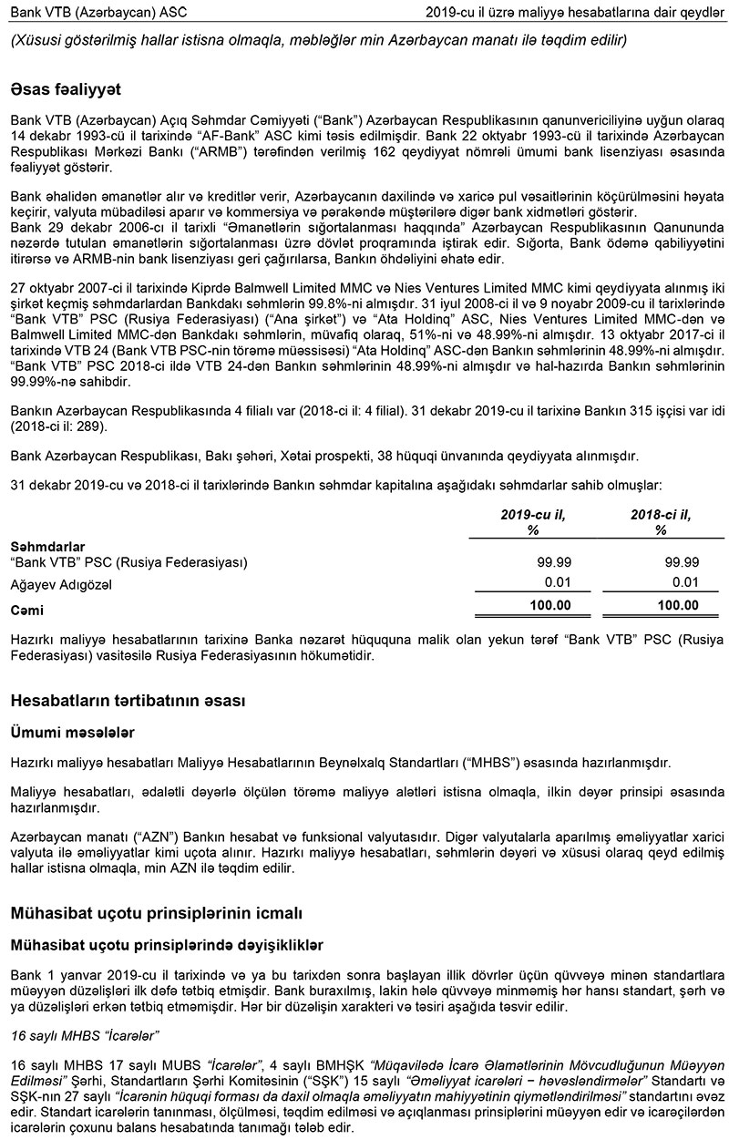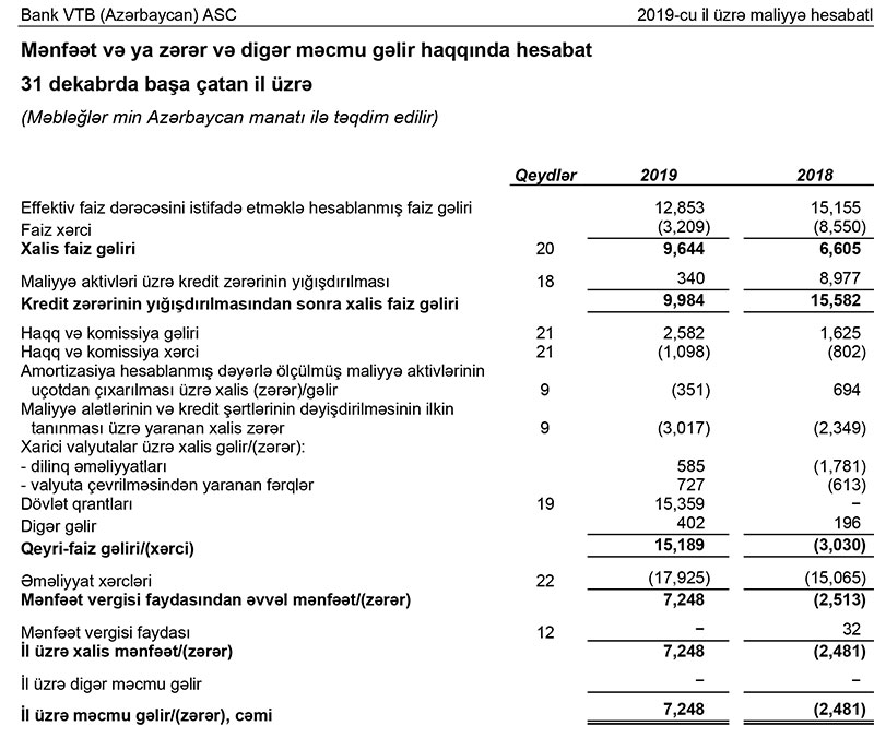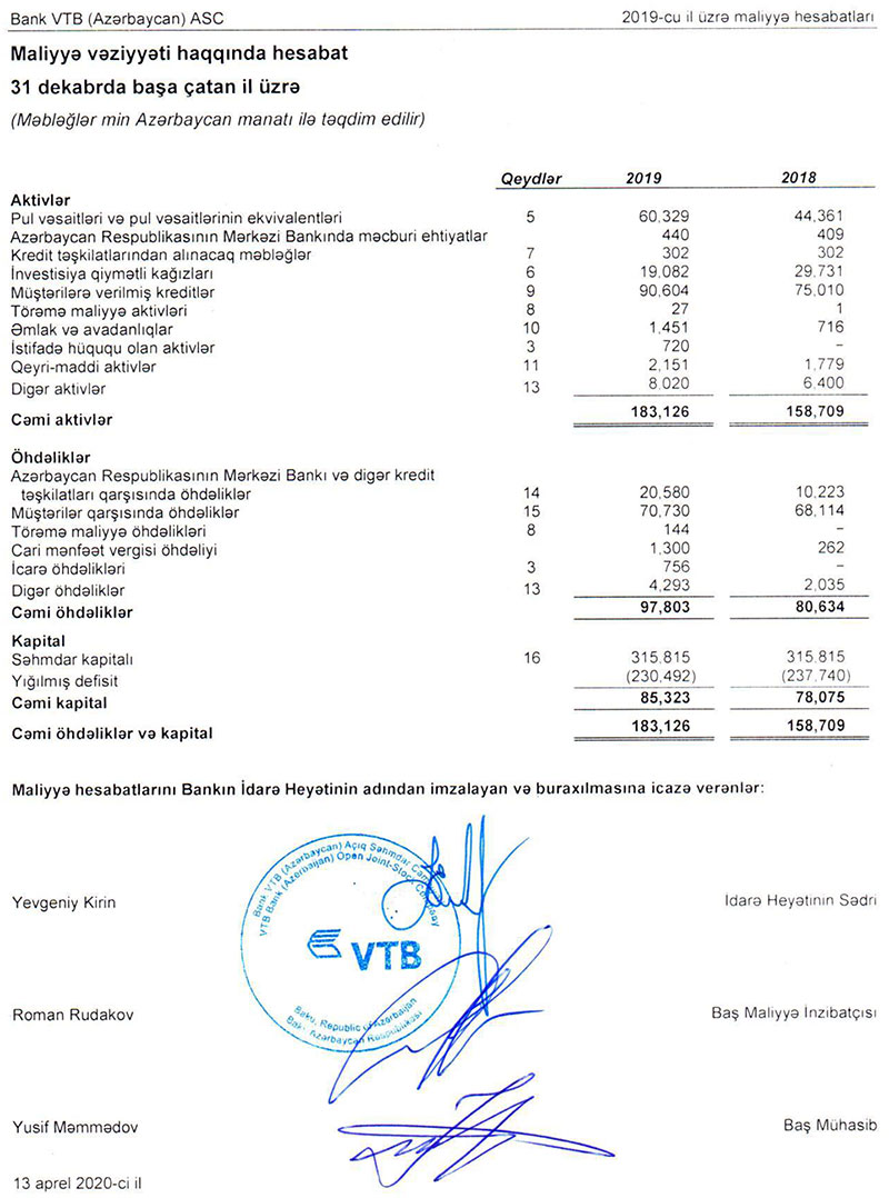 Bank VTB (Azərbaycan) Maliyyə Hesabatlarının Beynəlxalq Standartlarına (MHBS) əsasən 2019-cu ilin maliyyə nəticələrini elan edib. Ernst&Young müstəqil beynəlxalq şirkət tərəfindən təsdiqlənmiş audit rəyinə əsasən, 2019-cu ildə bank bütün əsas göstəricilər üzrə artım nümayiş etdirərək, 7 milyon 248 min manatadək xalis mənfəət əldə edib. Halbuki, Bank 2018-ci ili 2 milyon 481 min manat zərər ilə bağalmışdı.