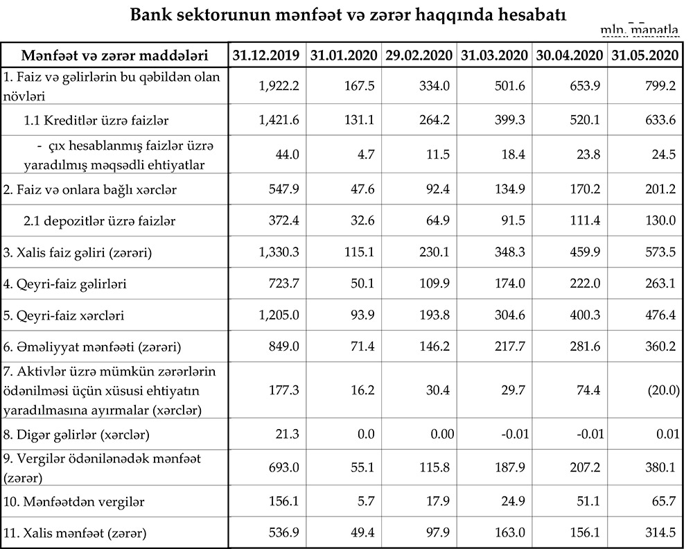 Azərbaycanın bank sektoru 2020-ci ilin May ayında 158,4 milyon manat xalis mənfəət əldə edib. Bu, sektorun 2020-ci ilin ilk 4 ayında (yanvar-aprel) əldə etdiyi xalis mənfəətdən çoxdur.