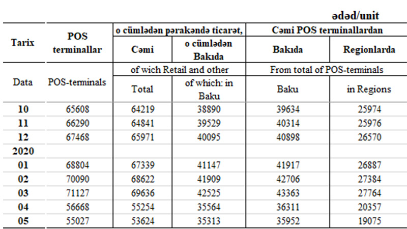 2020-ci ilin ilk 3 ayında cəmi POS-terminalların sayı 3 min 659 ədəd artaraq Mart ayının sonunda 71 min 127 ədədə çatmışdı. Növbəti aylarda POS terminalların sayı azalıb. Cəmi POS-terminalların sayı aprel ayında 14 min 459 ədəd, may ayında isə 1641 ədəd azalıb. Aprel-maydakı cəmi azalma 16 min 100 ədədir.