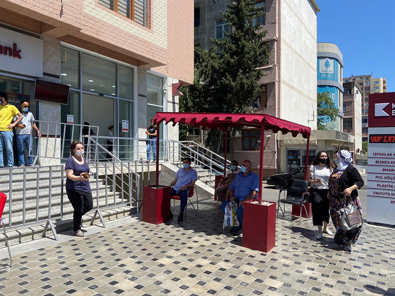 (®️) Kapital Bank koronavirusun (COVID-19) yayılması səbəbindən ölkədə xüsusi rejim tətbiq edildiyi üçün müştərilər üçün növbəti rahatlığı təmin edən tədbir həyata keçirib. Belə ki, havaların isti keçməsi və filiallara müştərilərin növbəli şəkildə buraxılması səbəbindən filialların önündə gündən qorunmaq üçün xüsusi çətirlər paylanılır.