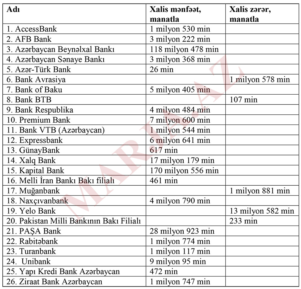 Ən çox xalis zərəri olan banklar isə Yelo Bank, Bank Avrasiya və Muğanbank-dır.