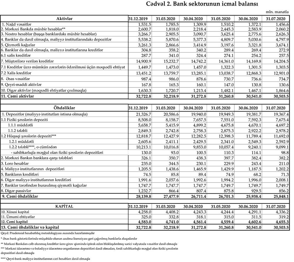 İyulda hüquqi şəxslərin müddətli depozitləri 43 milyon 600 min manat artaraq 2 milyard 592 milyon 900 min manat təşkil edib, tələbli depozitlər isə 141 milyon manat azalaraq 9 milyard 99 milyon 100 min manata düşüb.