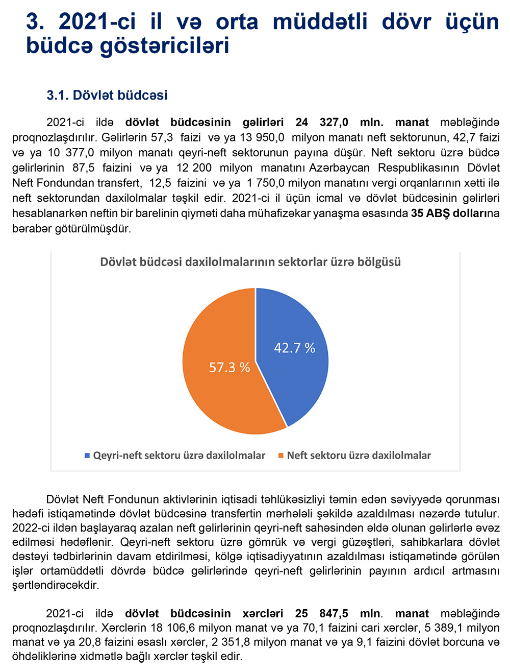 Marja-nın məlumatına görə, Azərbaycan Respublikasının 2021-ci ilin dövlət və icmal büdcələrinin ilkin göstəricilərinə dair açıqlamasında bildirilir ki, gəlirlərin 57,3 faizi və ya 13 milyard 950 milyon manatı neft sektorunun, 42,7 faizi və ya 10 milyard 377 milyon manatı qeyri-neft sektorunun payına düşür.
