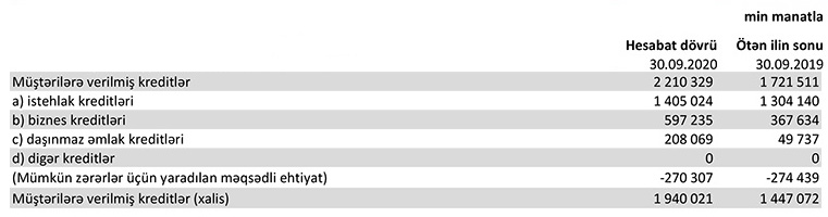30 Sentyabr 2020-ci il tarixində, 270 milyon 307 min manat mümkün zərərlər üçün yaradılan məqsədli ehtiyat xaric müştərilərə verilmiş kreditlər 1 milyard 940 milyon 21 min manat təşkil edib. Son 1 ildə Bankın xalis kredit portfeli 492 milyon 949 min manat artıb.