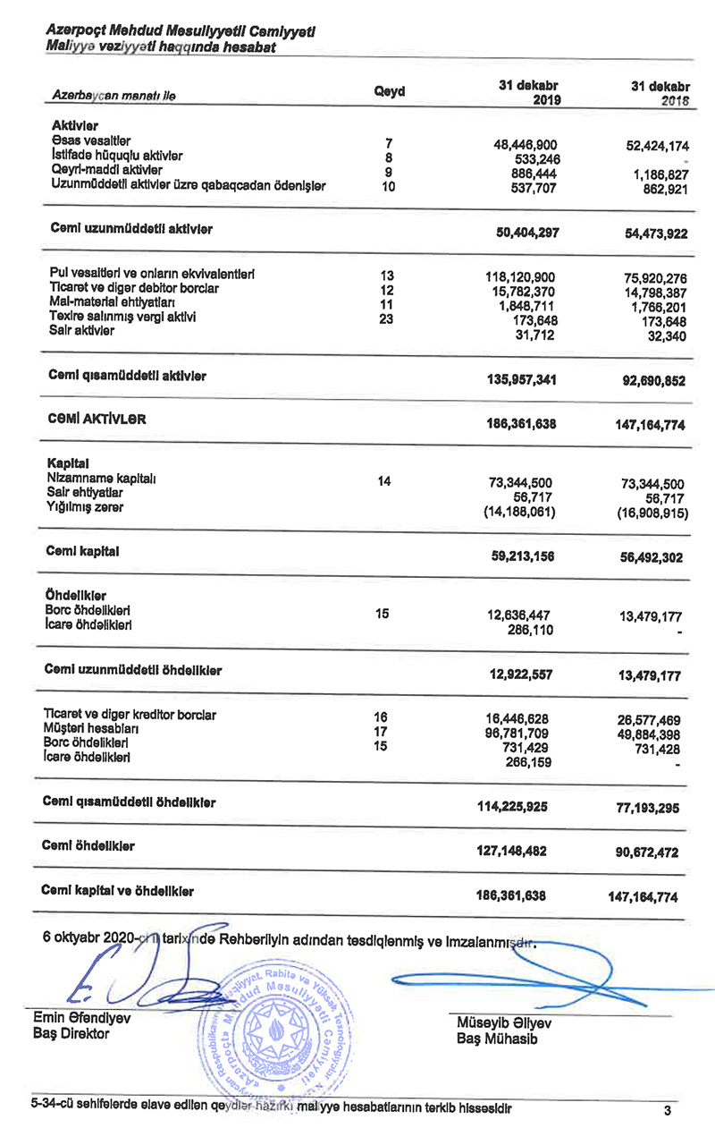 Bu il yanvarın 1-nə “Azərpoçt”un aktivləri 186 milyon 361 min manat olub ki, bu da 1 il əvvələ nisbətən 26,6% çoxdur. Hesabat dövründə şirkətin öhdəlikləri 40,2% artaraq 127,148 milyon manata, balans kapitalı isə 4,8% artaraq 59 milyon 213 min manata çatıb.