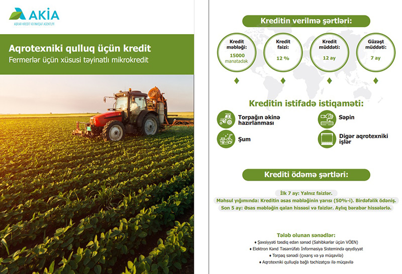 Kənd Təsərrüfatı Nazirliyi yanında Aqrar Kredit və İnkişaf Agentliyi fermerlər üçün yeni mikrokredit paketləri hazırlayıb. Bu mikrokreditlər aqrotexniki qulluq, gübrə alışı, yem tədarükü və alışı üçün nəzərdə tutulub.