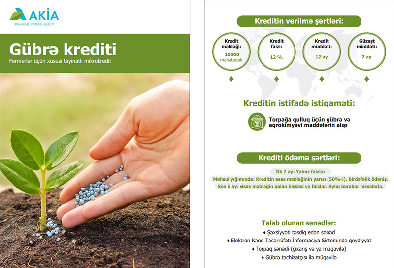 Aqrotexniki qulluq və gübrə mikrokreditlərini əldə etmək üçün fermerlərdən şəxsiyyəti təsdiq edən sənəd, EKTİS-də (Elektron Kənd Təsərrüfatı İnformasiya Sistemi) qeydiyyat, torpaq sənədi və müvafiq təchizatçı ilə müqavilə tələb olunur. Yem krediti üçün üçün müraciət edən heyvandardan şəxsiyyəti təsdiq edən sənəd, EKTİS-də qeydiyyat və yem təchizatçısı ilə müqavilə istəniləcək.