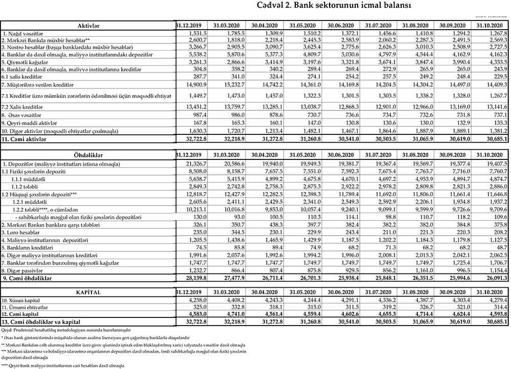 30 oktyabr 2020-ci il tarixinə olan bank sektorunun əsas göstəriciləri açıqlanıb.