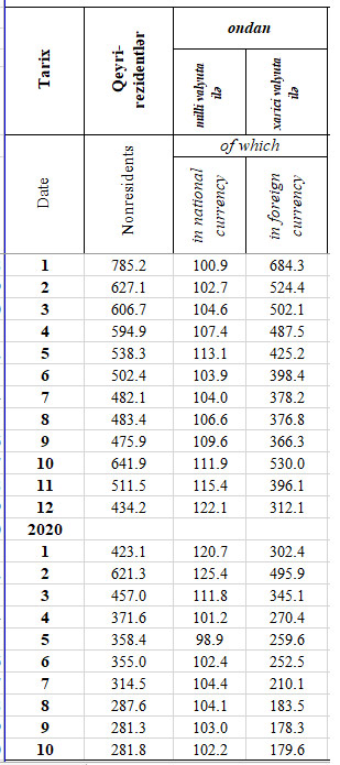 Marja Mərkəzi Banka istinadən xəbər verir ki, 2020-ci ilin 10 ayı ərzində Azərbaycan banklarındakı fiziki şəxs olan qeyri – rezidentlərin cəmi əmanətləri 1,5 dəfə azalaraq 281 milyon 800 min manata geriləyib. Ötən ilin sonunda qeyri – rezidentlərin cəmi əmanətləri 434 milyon 200 min manat təşkil etmişdi.
