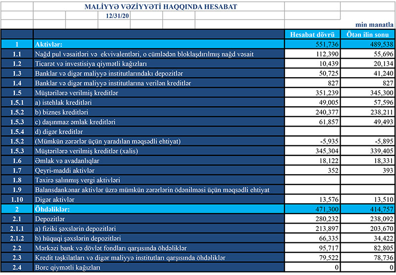 2019-cu illə müqayisədə 2020-ci ildə “Turanbank”ın cəmi aktivləri 62 milyon 198 min manat artaraq 551 milyon 736 min manat, o cümlədən müştərilərə verilmiş kreditlər 5 milyon 939 min manat artaraq 351 milyon 239 min manat təşkil edib.