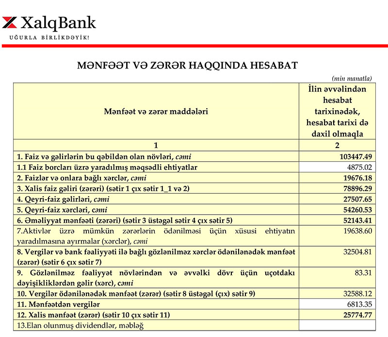 Pandemiya ili kimi yadda qalan 2020-ci ili Xalq Bank 25 milyon 775 min manat xalis mənfəət ilə başa vurub. Bank 2019-cu ili 33 milyon 447 min manat xalis mənfəət ilə bağlamışdı.